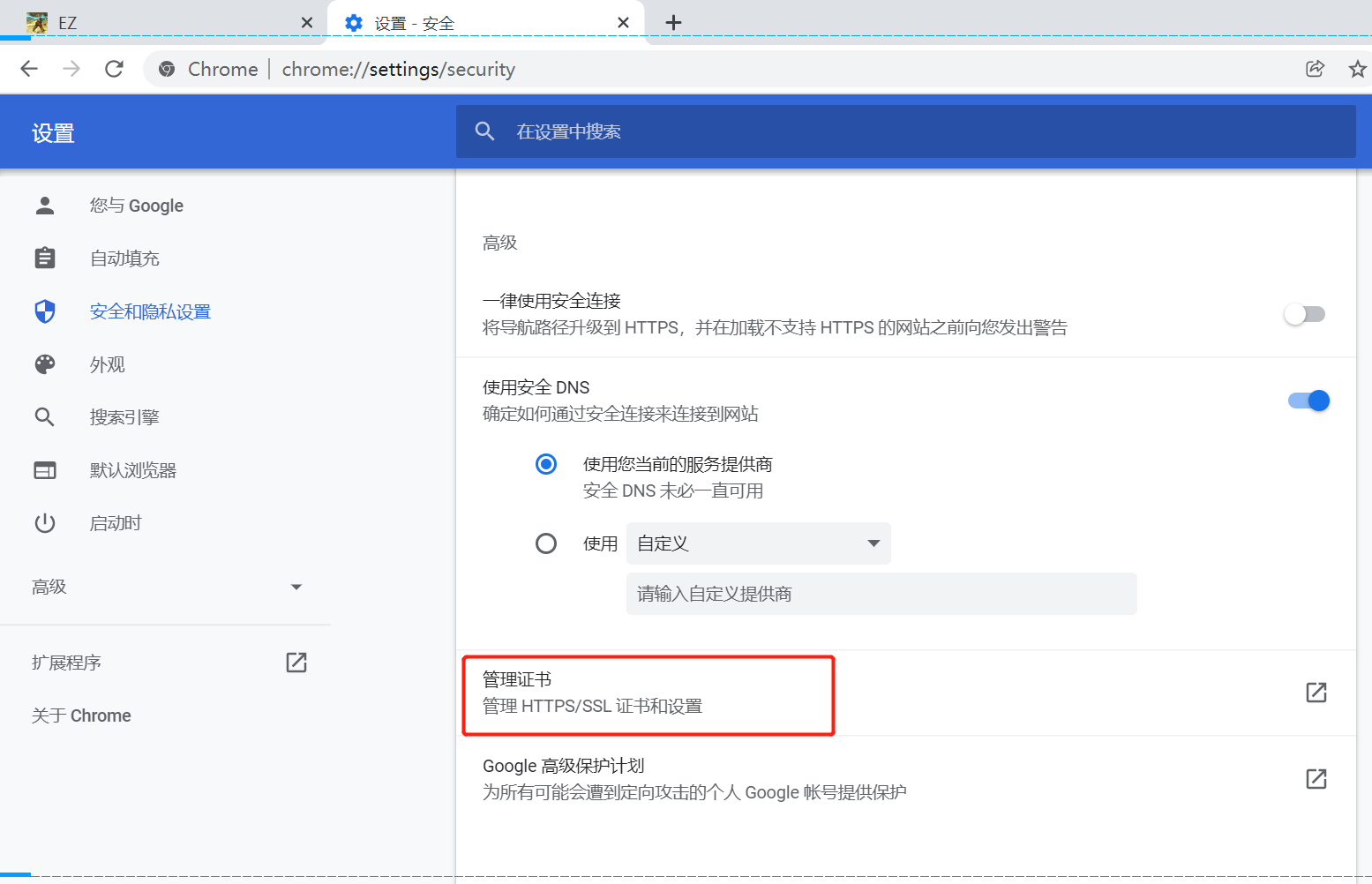 ) - 安全与隐私设置 - 安全 - 管理证书,如下图所示: