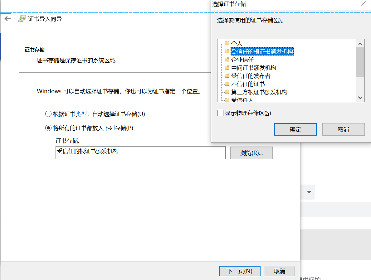证书,随后在证书存储页面-将所有证书都放入下列存储选择受信任的根证书颁发机构,如下图所示: